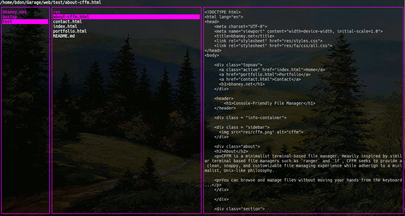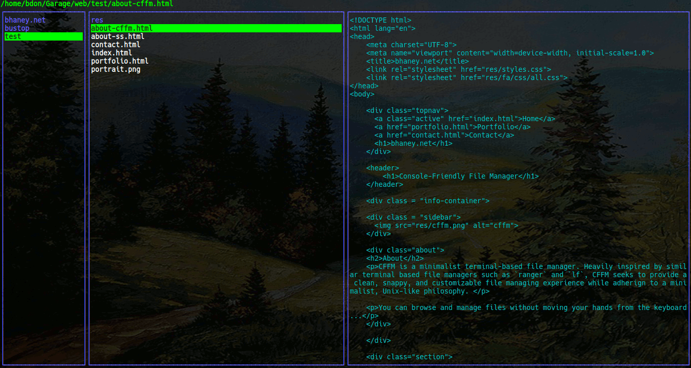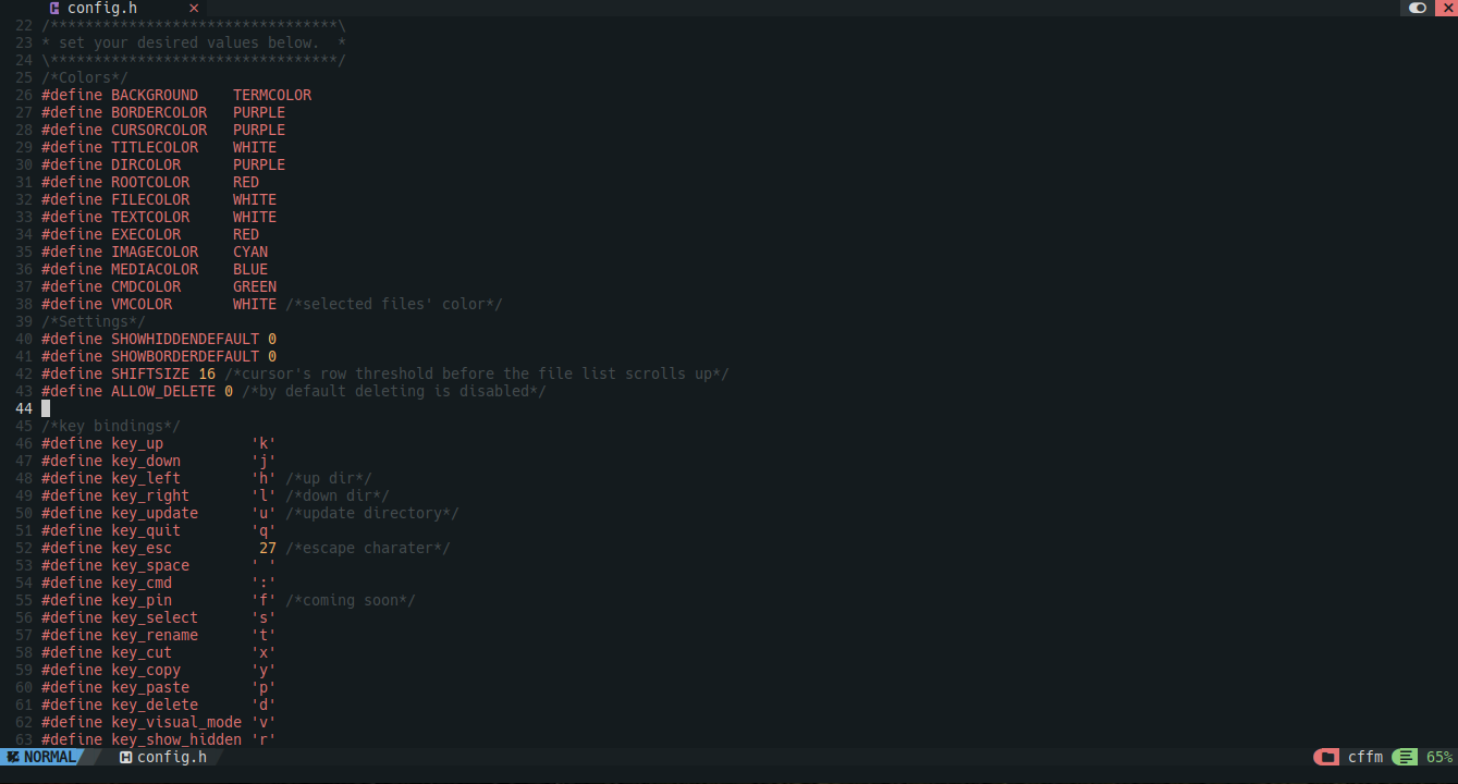 CFFM's design philosophy was inspired heavily by the Suckless Philosophy. Whether or not experienced hackers would consider CFFM truely "Suckless" or "KISS" is debatable, however one thing is for sure, and that is that CFFM is minimalist and not bloated. I have been using `ranger` for about a year now, and I couldn't help but notice that it was lagging behind and sometimes not responsive. This is because it was written in python, and was calling external scripts to execute commands. I was interested switching to the file manager `lf`, however it too used external configuration files and building it required installing golang. I always liked Suckless' `dwm` and `st` due to their configuration being compiled directly into the program, as well as for the fact that they are extremely portable and light programs. So, I decided to write my own terminal file manager, with simplicity and portability in mind.